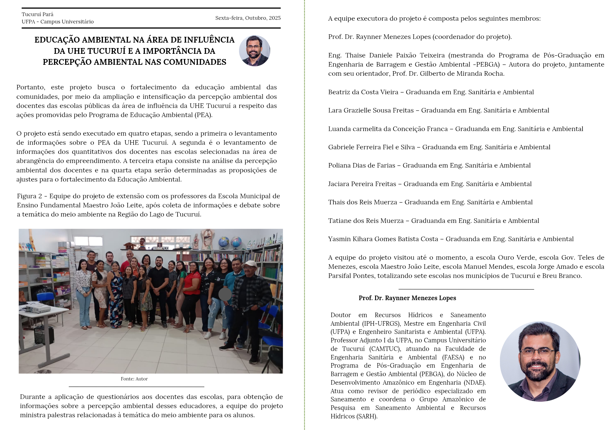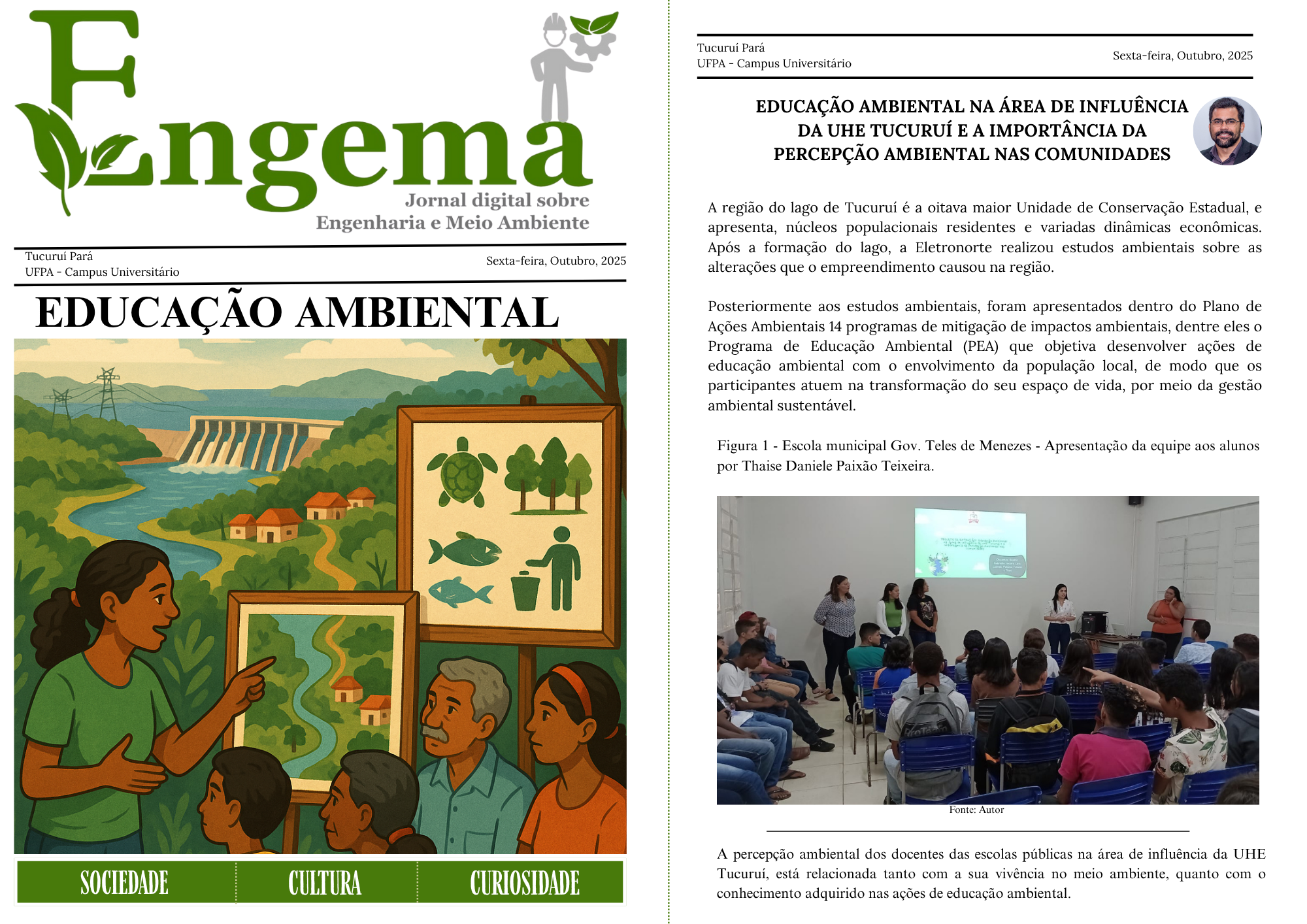 O destaque desta edição é a contribuição do Prof. Dr. Raynner Menezes Lopes, com o artigo intitulado “Educação Ambiental na área de influência da UHE Tucuruí e a importância da percepção ambiental nas comunidades”. A análise evidencia como a percepção ambiental das populações que vivem no entorno da Usina Hidrelétrica de Tucuruí é determinante para a preservação dos recursos naturais e para o equilíbrio socioambiental.