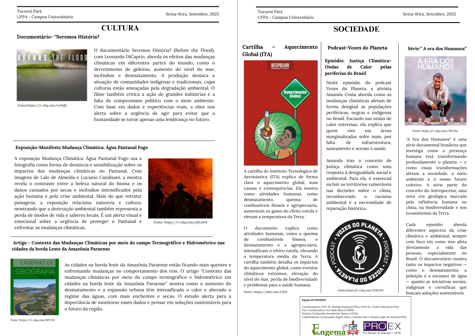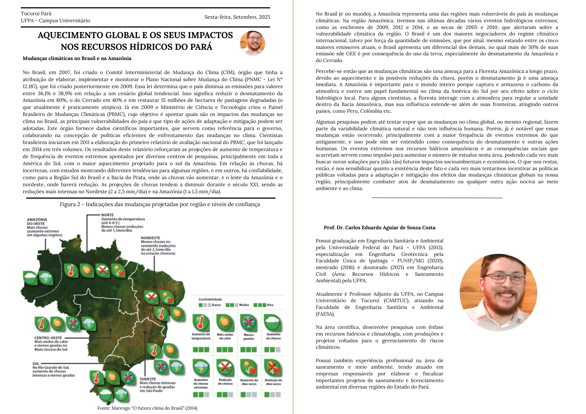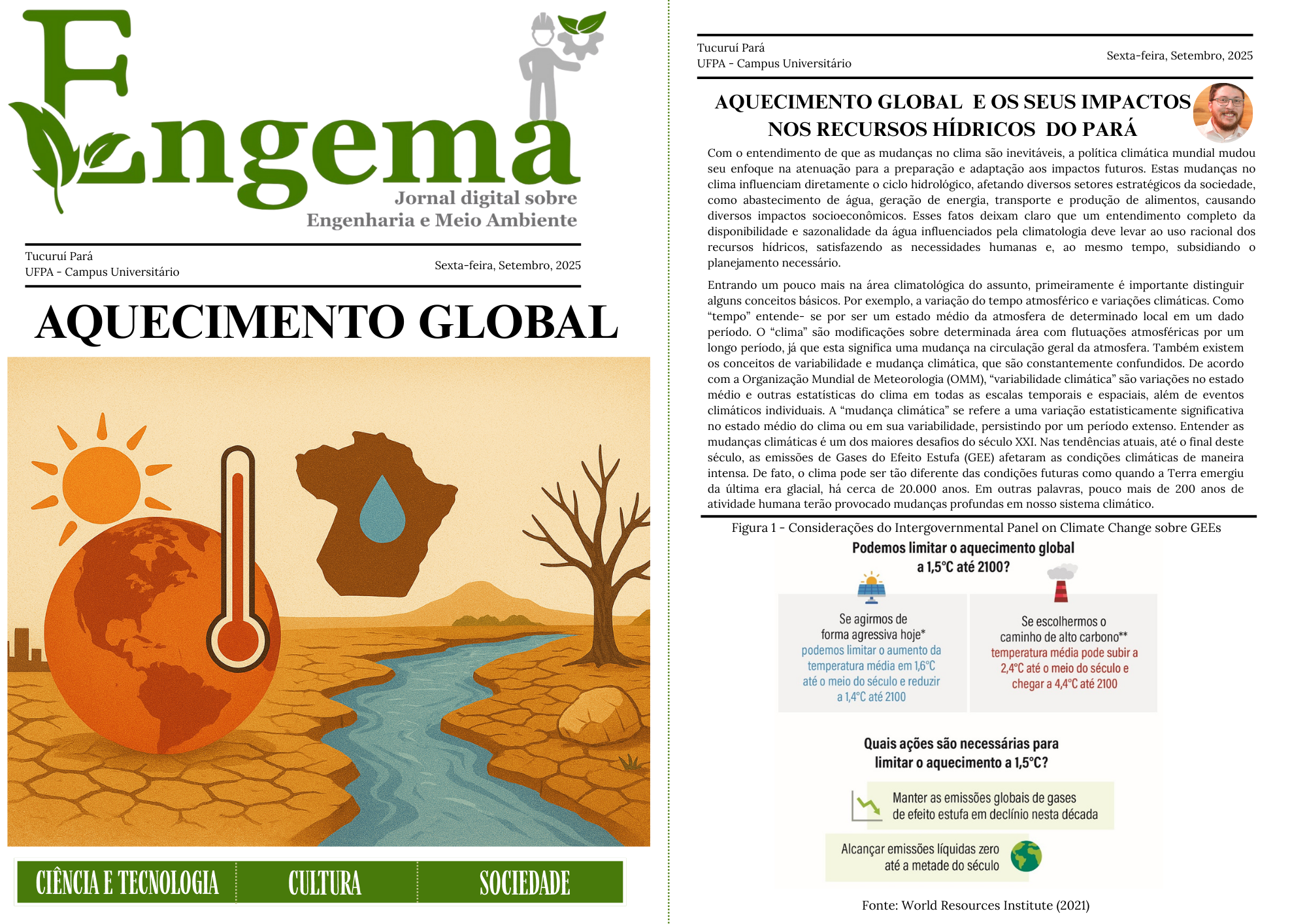 Título: Aquecimento Global e seus impactos nos recursos hídricos do Pará, O ENGEMA em Foco retoma suas discussões a partir das publicações da primeira edição, mantendo o compromisso de refletir sobre os grandes desafios socioambientais que marcam o Brasil e, em especial, a Amazônia. O destaque desta edição é a participação do Prof. Dr. Carlos Eduardo Aguiar de Souza Costa, com o artigo intitulado “Aquecimento Global e seus impactos nos recursos hídricos do Pará”. A análise evidencia como as mudanças no clima influenciam diretamente o ciclo hidrológico, afetando o abastecimento de água, a geração de energia, o transporte e a produção de alimentos, com consequências socioeconômicas relevantes para a região amazônica. A contribuição busca esclarecer os riscos relacionados à disponibilidade e à qualidade da água em um cenário de mudanças climáticas, chamando a atenção para a necessidade de adaptação, planejamento e gestão sustentável dos recursos hídricos no Pará.