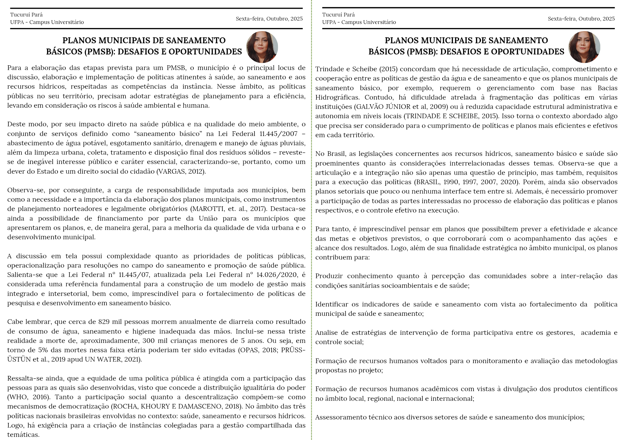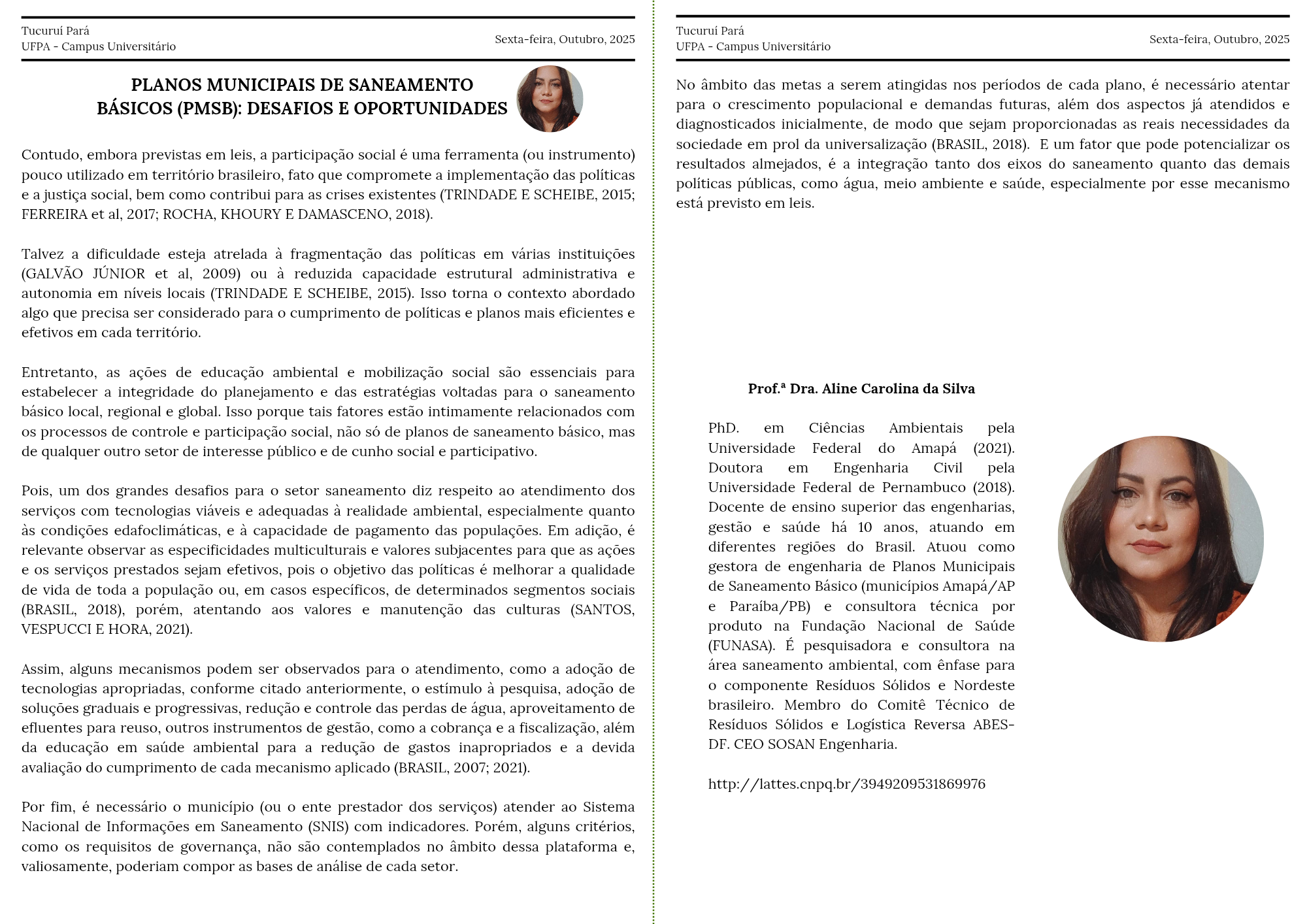 A Profa. Dra. Aline Carolina da Silva apresenta o artigo “Planos Municipais de Saneamento Básico (PMSB): Desafios e Oportunidades”, que discute as dificuldades enfrentadas pelos municípios e acrescenta reflexões sobre soluções possíveis, participação social e gestão responsável dos recursos.