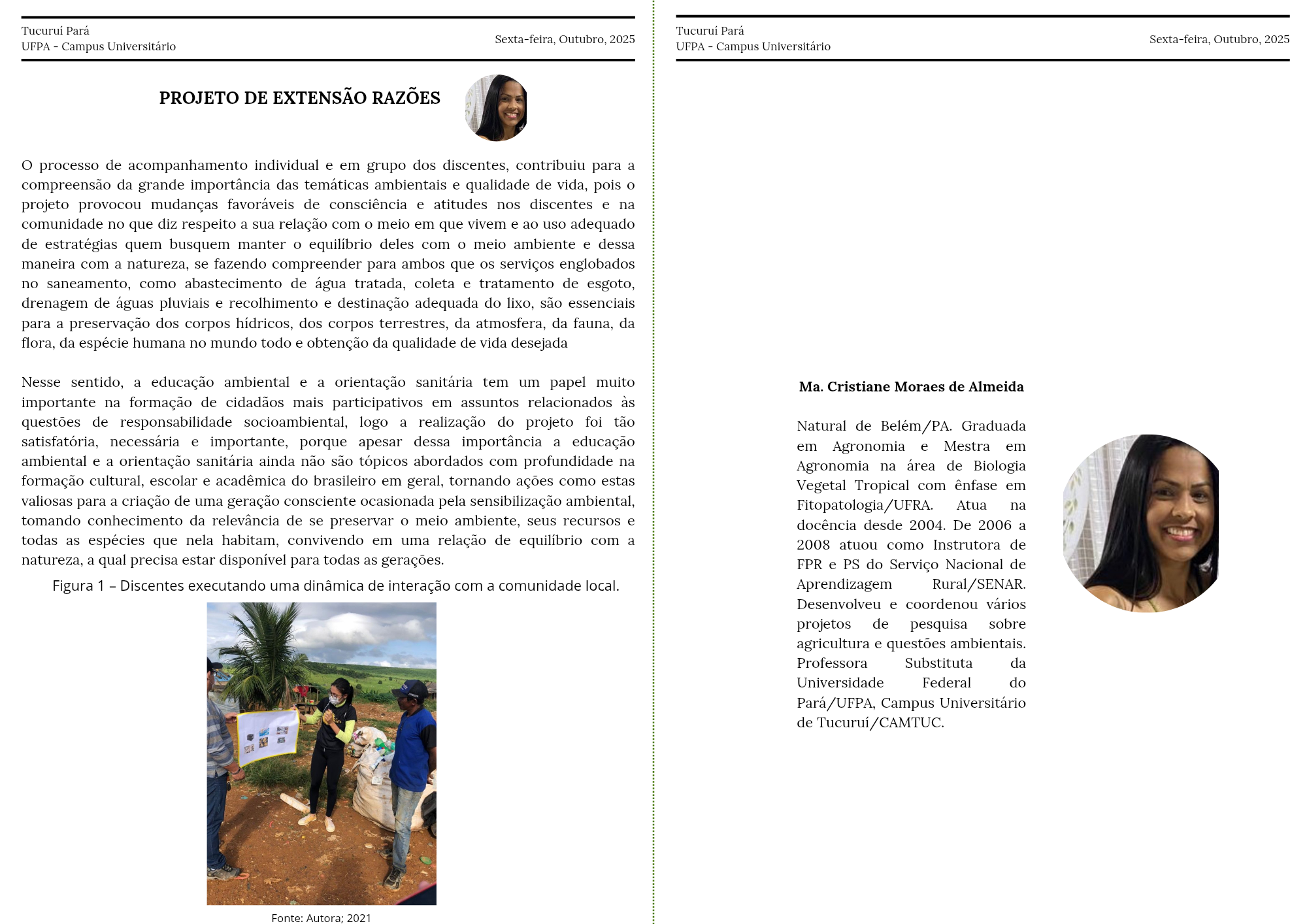 A Profa. Ma. Cristiane Moraes de Almeida apresenta o artigo “Projeto Razões: Ação Social e Voluntária”, que propõe reflexões sobre práticas educativas e ações comunitárias voltadas à transformação socioambiental.